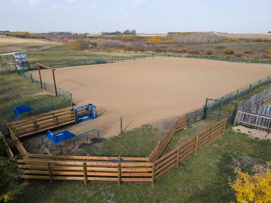 insulated & heated, equipped with viewing mezzanine for spectators, heated & enclosed announcer stand, roping chute, large indoor tie rail.